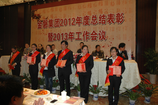 2013年2月23日,金磐集團2012年度總結(jié)表彰大會暨2013年工作會議在集團旗下和美金磐大飯店十三樓和美廳隆重召開,各分公司經(jīng)理、項目經(jīng)理及公司全體員工近200人參加了此次會議。金華市建設(shè)局副局長姚栓柱先生、金華市建設(shè)局法規(guī)處處長李志余先生、磐安縣建設(shè)局局長張余平先生、金華市建筑業(yè)行業(yè)協(xié)會會長吳文亞先生等應(yīng)邀出席了本次會議。