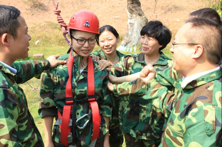 訓(xùn)練正式開始了。我們隊(duì)分成兩個(gè)小隊(duì),第一個(gè)項(xiàng)目是空中斷橋。任務(wù)是每一位隊(duì)員都爬上高八米寬30公分的木板,間隔1.2米,自斷橋一端躍起,跨至另一端并返回。項(xiàng)目開始后,第一個(gè)上場(chǎng)的是我們總工程師姜總,大家?guī)退潆姡翱谔?hào),鼓勵(lì)他。別看他胖乎乎的,爬的可神速啦,不過在那個(gè)八米高的高空,大家都替他捏了一把汗。意想不到的是他毫不猶豫,一躍而過,神速的下來了,大家的心情稍微輕松了一點(diǎn)。接下來的隊(duì)員在姜總的鼓勵(lì)下一個(gè)個(gè)都勇敢的上去了,在那高空,有人猶豫過,有人尖叫過,不過都在下面隊(duì)員的鼓勵(lì)指揮下,勇敢的完成了任務(wù)。真是斷橋一小步,人生一大步,考驗(yàn)了大家的自信心。